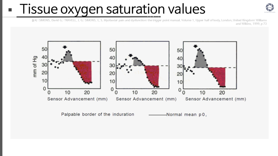 2. 독일어로 보고된 멋지게(elegantly) 계측되고 검증된 한 연구는 병변(affected) 근육에 국소 저산소증이 있는지 검사했고 주목할 만한 긍정적인(positive) 결과를 보고했습니다. 이 연구는 근육경화증(myogelosis)(Myogelosen)을 가진 것으로 진단된 세 환자의 등 근육에 압통을 지닌, 긴장된 변근육경화(induration)(Muskelharten)에서 발견한 것들을 보고했습니다. 그림 2.27은 이러한 방식으로 검사를 받은 세 환자의 그래픽 결과를 보여줍니다. 산소 센서를 압통 경화점[TrP]에 접근시킴에 따라 처음 5~8mm 센서 진행(advancement)은 연속적인 0.7mm 진행단계와 함께 조직 산소 장력의 정상적인 무작위 변주(variation)를 보여줍니다. 프로브가 압통 경화점의 접촉가능한 경계(palpable border)에 접근함에 따라, 마치 저산소증 영역을 둘러싸는 보상성 과혈증(hyperemia)이 있는 것처럼 조직 산소 장력이 증가했습니다. 최고점에 도달한 후, 조직 산소 장력은 갑자기 거의 (그러나 완전하게는 아닌) 0으로 떨어졌는데, 이는 경화점의 중심 영역에 심각한 저산소증이 있음을 가리킵니다. 산소가 결핍된 중심부를 둘러싸고 있는 산소 장력 증가 부위의 부피가 적어도 저산소증 조직의 부피만큼 컸다는 점은 주목할 만합니다.