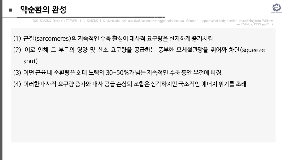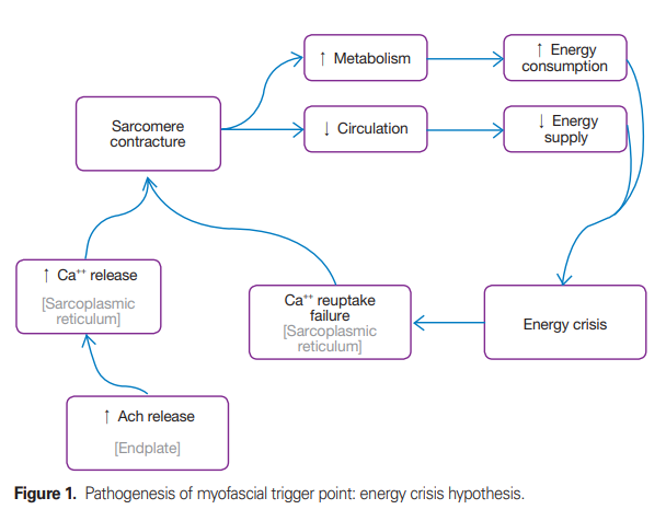 칼슘을 근막세포체로 되돌리는 칼슘이온 펌프는 적절한 아데노신 삼인산(ATP) 공급에 의존하며, 수축 메커니즘보다 낮은 ATP 농도에 더 민감한 것으로 보입니다. 따라서 칼슘이 근막소포체로 회수되지 못 한다면(impaired) 수축 요소들을 더 증가된 칼슘 농도와 더 증가된 수축 활성에 노출시킬 것입니다. 이것은 악순환을 완성시킵니다. 또한, 이러한 심각한 국소 저산소증과 조직 에너지 위기는 국소 유해수용체를 민감하게 만들 수 있는 혈관활성물질의 생성을 자극할 것으로 예상됩니다.