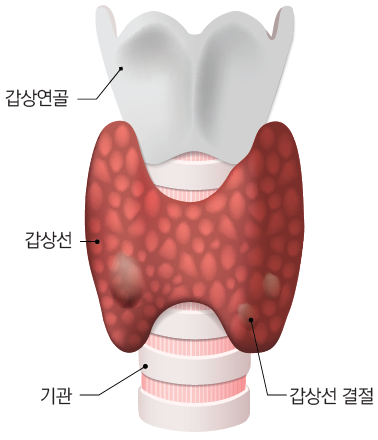 갑상선 질환에 의해 갑상선의 크기가 커지게 되면 정상일 때는 잘 안보이던 갑상선이 눈에 띄게 목 앞쪽으로 튀어나오게 됩니다. 이렇게 갑상선이 전체적으로 커진 상태를 '갑상선종'이라고 합니다. 그래서 일반적으로 '목이 나오면 갑상선 질환이다'라고 알려집니다. 갑상선종이 있으면 병원을 방문하여 정말 갑상선 질환이 있는지, 치료를 받아야 하는 상태인지 진단을 받는 것이 좋습니다.