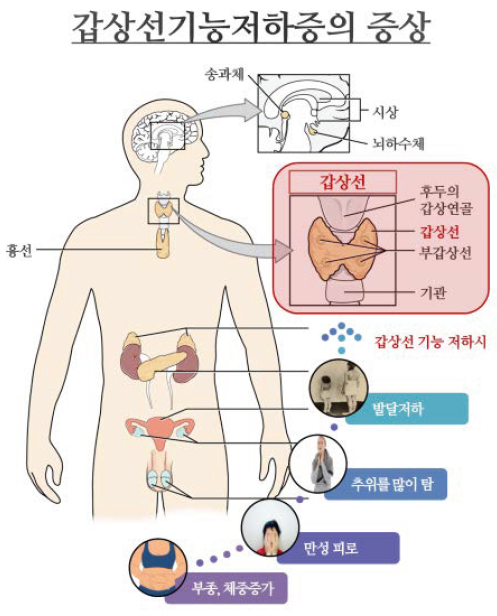 ● 피로, 체중 증가, 한불내성(寒不耐性), 위장관 운동의 감소 및 변비, 식욕 감퇴, 피부 건조, 부종, 월경 불순, 월경량 증가 등 다양한 증상이 나타납니다.