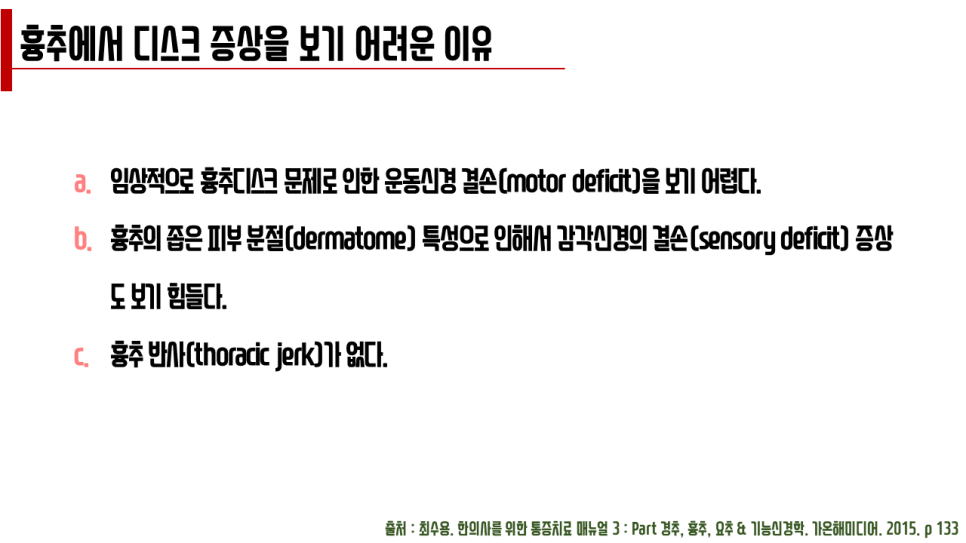 1. 임상적으로 흉추디스크 문제로 인한 운동신경 결손(motor deficit)을 보기 어렵다.