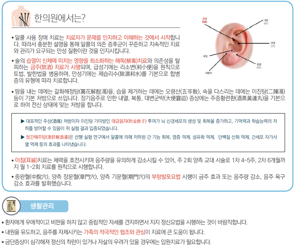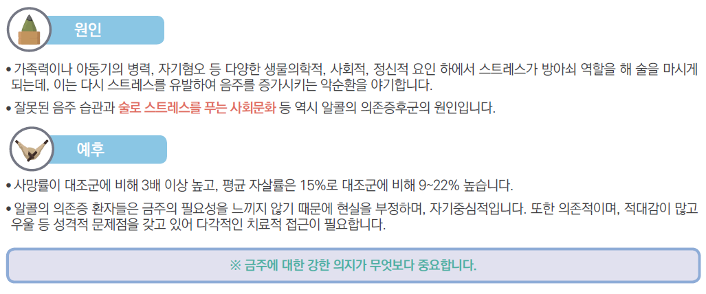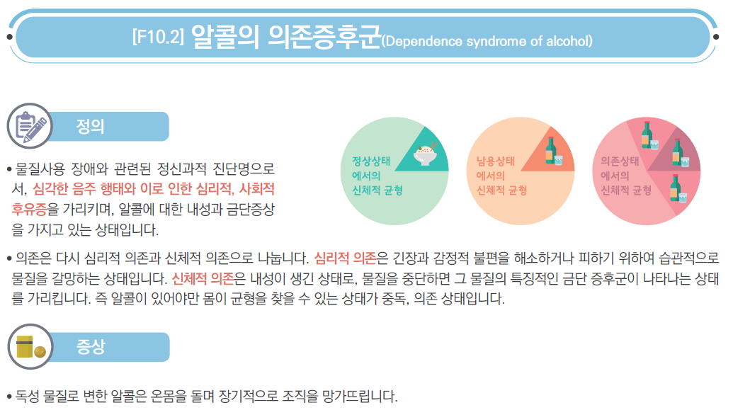 알코올 의존 또는 중독이란 지속적이고 반복적인 과도한 음주로 인해 신체적, 정신적, 사회적 기능이 손상되는 만성 질환입니다. 현재 알코올 의존자는 전체 국민의 10%, 알코올 남용자는 20%에 달합니다. 알코올 남용이 음주로 인한 사회적, 법적인 문제를 야기하는 측면에서 접근한다면, 알코올 의존은 알코올의 장기적인 약리적인 효과로 인한 개인의 기능의 생리적인 변화와 기능 장애를 의미합니다.
