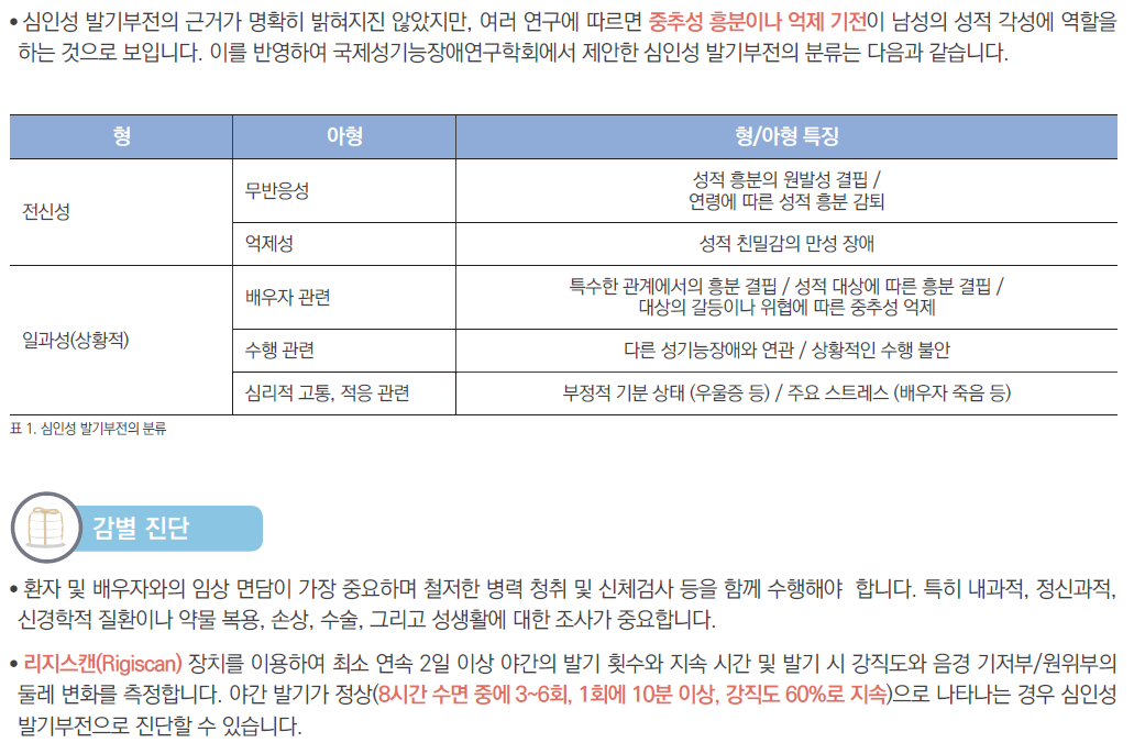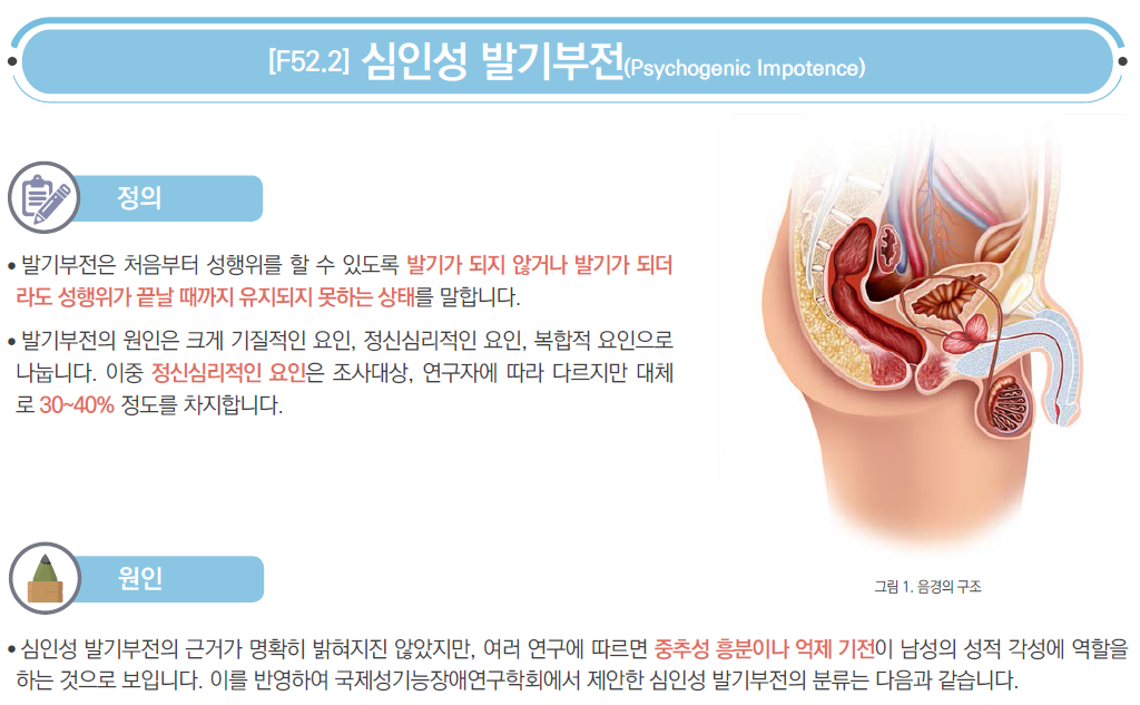 젊은 연령대에 발생하는 발기부전은 검사상 육체적인 이상은 확인되지 않지만, 심리적인 이유로 발생하는 ‘심인성 발기부전’이 많습니다. 심인성 발기부전은 말 그대로 정신적인 문제로 인해 발생하는 발기부전입니다.