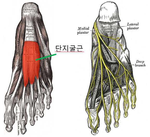 발바닥 신경은 단지굴근(Flexor digitorum brevis)의 과긴장에 의해 포착되기 쉽습니다. 단지굴근은 종골 내측돌기에서 시작하여 2,3,4,5번째 발가락의 middle phalanx의 양측 면에 정지합니다. 발가락 굴곡시키는 기능을 하죠. 단지굴근의 내측 부위가 과도하게 긴장하면 1,2,3번째 발가락과 4번째 발가락 내측에 이상감각을 표현할 수 있습니다. 단지굴근의 과긴장은 발가락을 과신전한 상태가 오랜 시간 지속되거나 반복적으로 강한 과신전 동작을 하게 되면 발생할 수 있습니다.