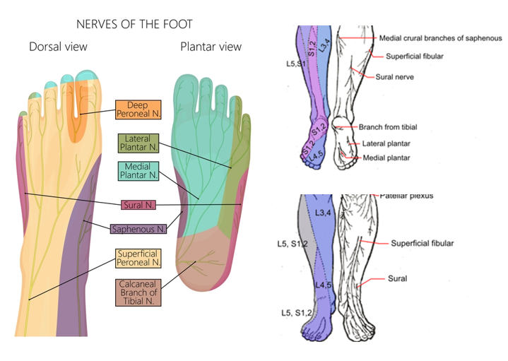 엄지발가락의 발바닥쪽 감각은 경골신경(Tibial nerve)에서 분지하는 내측 발바닥신경(Medial plantar nerve)의 지배를 받습니다. 발가락 끝은 발바닥 신경(Plantar nerve)에 의해 지배를 받습니다. 손가락에서도 손등쪽 감각은 요골신경(Radial nerve)이 담당하나 손등쪽에서 손가락 끝 한마디는 정중신경(Median nerve)의 지배를 받는 것처럼 발등쪽 발가락 끝은 총비골신경이 아닌 발바닥 신경에 의해 지배받습니다.