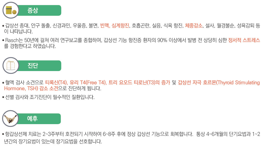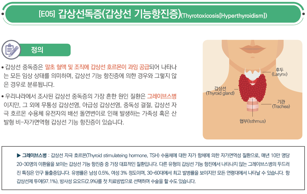 우리 목 안에는 나비 모양의 갑상선이라는 기관이 있습니다. 갑상선에서는 갑상선호르몬을 배출하여 우리 몸의 여러 기능을 조절합니다. 갑상선기능항진증은 갑상선호르몬이 정상보다 많이 분비되어 몸의 에너지가 빨리 소모되고 많은 기능이 항진되는 질병을 말합니다.