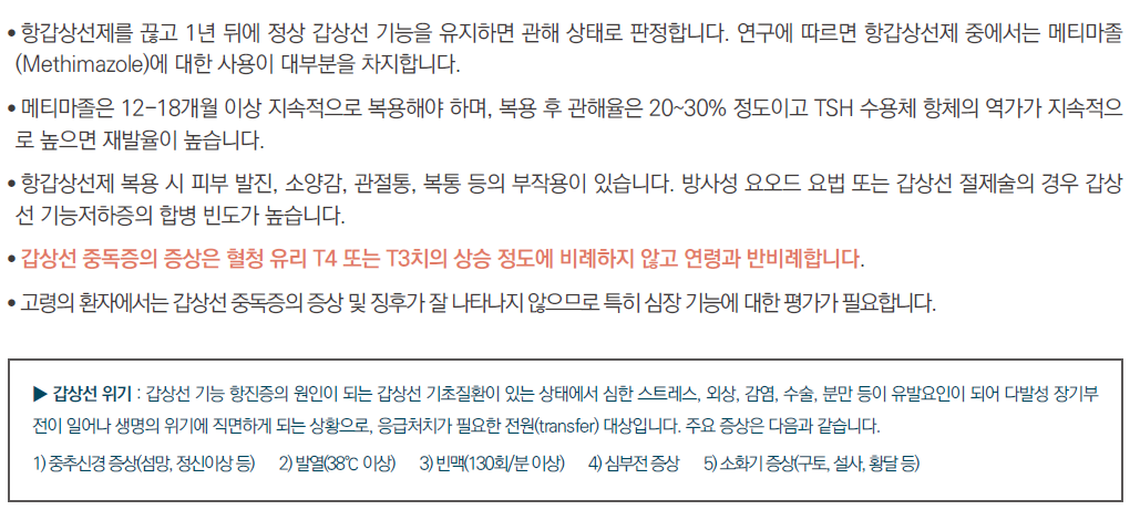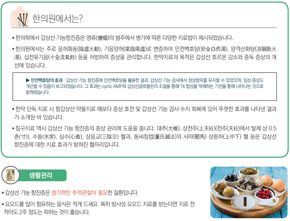 갑상선 호르몬 항진의 경우 자가면역질환이 많기 때문에 안티로이드나 메티마졸 복용시 한방치료를 병행할 경우 재발율을 줄이고 호르몬제의 장기복용을 피할 수 있습니다. 갑상선 결절등으로 인해 방사성 요오드 치료를 받거나 수술 등으로 갑상선 절제를 했을 경우 갑상선 기능저하증이 올 수 있어 수술이전 관리 치료 혹은 수술이후 갑상선 기능저하증의 면역개선 등을 함께 고려하여 치료하는 것이 좋습니다.