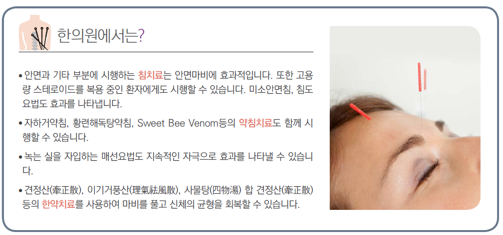 안면마비는 특히 얼굴 부위에 나타나는 병변으로 인해 환자가 스트레스를 많이 받는 편이기 때문에 안면마비의 초기증상이나 전조증상이 나타날때 주의깊게 증상 경과를 살피면서 적절한 치료 및 조치를 취하는 것이 무엇보다 중요합니다.