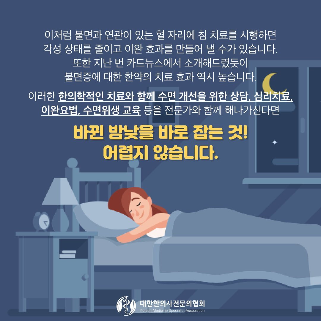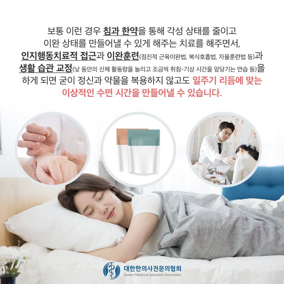 한의학적인 치료(침, 한약, 약침, 추나 등)로 깊은 숙면을 취할 수 있습니다.