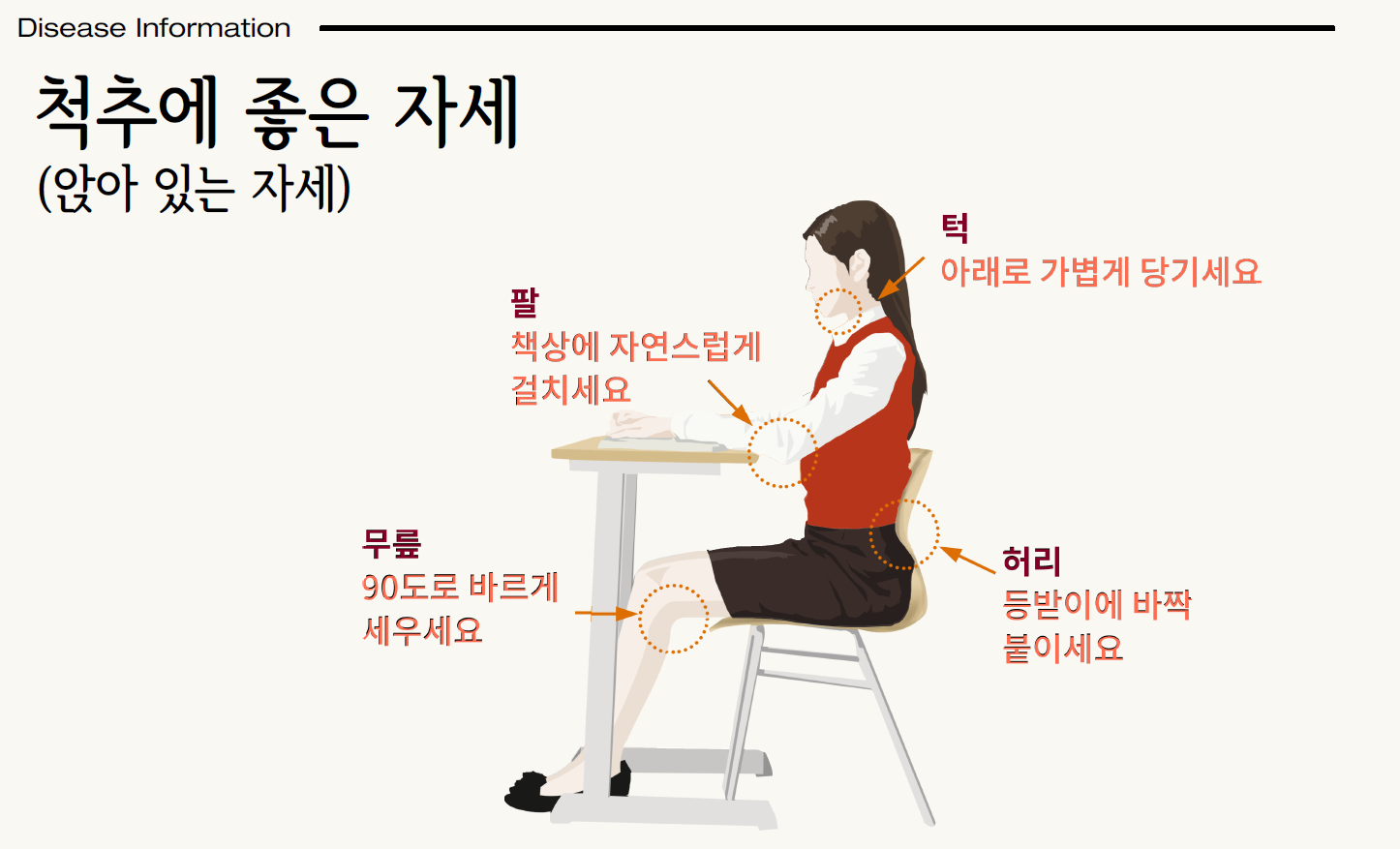 1) 앉아서 일할때 자세를 최대한 바르게 해주시고,