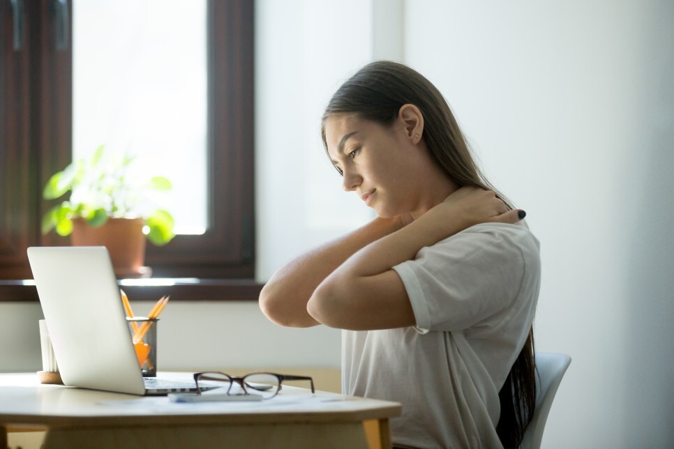 우선 개개인의 몸에 맞게 책상과 의자 및 모니터의 높이를 조절합니다. 코로나로 재택근무와 사무실 근무를 교대로 하시는 환자분들의 경우 오피스 환경이 갖춰지지 않은 집에서 근무할때 양반다리를 하고 노트북을 보거나 소파에서 무릎에 노트북을 놓고 근무했더니 목이 더 아프다고 내원하시는 경우가 종종 있었습니다. 적당한 높이의 의자와 책상 모니터 받침대를 활용해주세요. 무릎과 발목이 직각이 되도록 앉았을때 발바닥이 편안하게 땅에 닿도록 의자 높이를 조절합니다. 타이핑할때 손목이 키보드 높이와 맞도록 책상 높이를 조절하고, 목을 굽히지 않고 모니터를 볼 수 있도록 반듯하게 앉았을때 모니터의 맨 윗부분이 눈높이보다 6-8cm 아래에 있도록 조절합니다. 완전 직각인 등받이보다는 100-110도정도 기울어져 허리와 어깨를 지탱해줄수 있도록 등받이 기울기를 조절합니다.