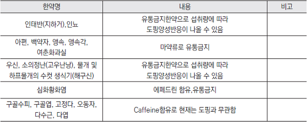 도핑금지성분을 포함할 가능성이 있는 한약재 (한약공정서 수재품)