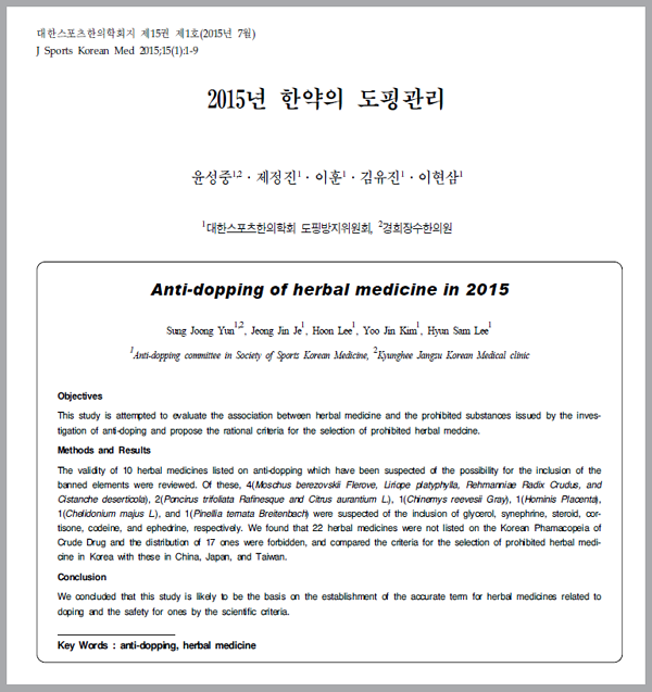 2015년 7월, 스포츠한의학회 도핑방지위원회의 연구 결과물로 대한스포츠한의학회지에 ‘2015년 한약의 도핑관리’라는 논문을 발표하였습니다. 이는 KADA 홈페이지에 공고된, 도핑과 관련되었다는 한약재에 대한 내용이 대부분 ‘근거 없음’을 밝히는 논문임과 동시에 그간 모호하게 혼용되었던 한약과 식품을 구분하여 ‘한약’에 대한 개념을 명확히 밝히며, 도핑과 관련된 한약재에 대해 올바른 정보를 제공했다 할 수 있습니다. 논문 발표 후 스포츠한의학회에서는 한의사협회 홈페이지와 한의사 커뮤니티 등을 통해 온라인상에 도핑 관련 한약재에 대한 정보를 공유하고 있으며, 학회의 팀닥터 강의와 보수교육을 통해 이에 대해 교육하고, 주의해야 할 한약재 사용에 대해서 지속해서 홍보해 오고 있습니다.