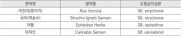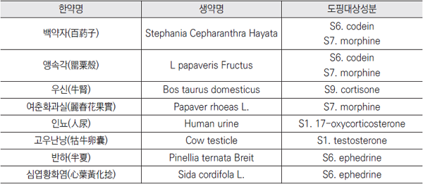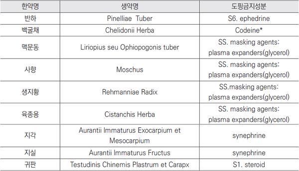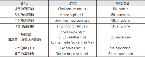 도핑금지성분을 포함할 가능성이 있는 한약재 (한약공정서 수재품)