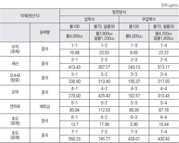 다빈도 처방 한약 3종을 표준한약 처방에 따라 제조하여 2일(1일 3회)간 복용한 대상자의 소변을 채취하여 소변 내 금지약물의 포함 여부를 확인한 결과, 금지약물이 검출되지는 않았으나 이는 해당 실험설계 하에서 안전하였다는 제한적 결론이 도출되었습니다. 즉, 동일한 처방 한약이라 하더라도 표준 한약 처방 이외의 응용이나 첨가 또는 탕약의 제조과정이 상이할 경우 본 실험의 결론과 차이가 발생할 가능성이 있다고 제시한 것입니다.