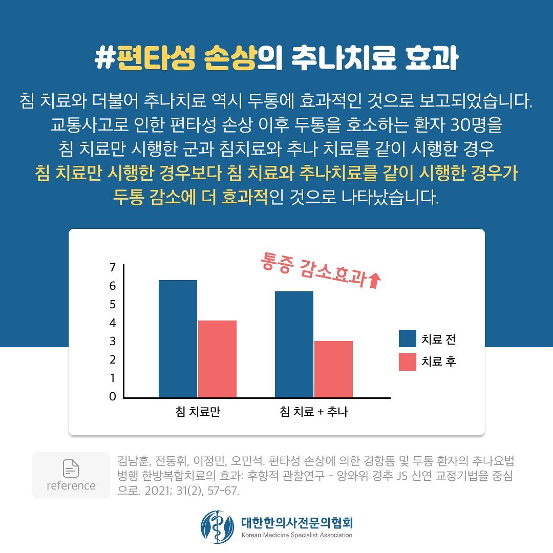 이번 카드뉴스에서는 편타성 손상으로 인한 두통에서 침, 추나 치료가 통증을 감소시킨 연구를 소개해드립니다.