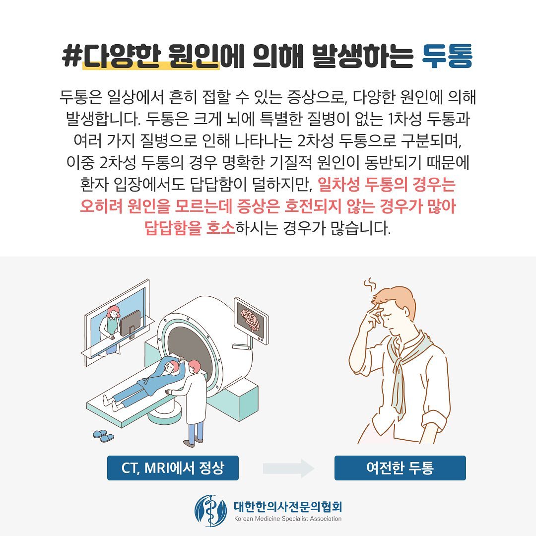 그럼에도 CT, MRI 등 검사에서 원인이 없는 경우를 일차성 두통이라고 합니다.