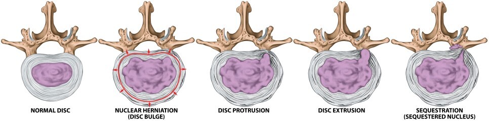 추간판탈출증은 정도에 따라 팽륜 bulging, 돌출 protrusion, 탈출 extrusion, 부골화 sequestered disc로 분류됩니다.